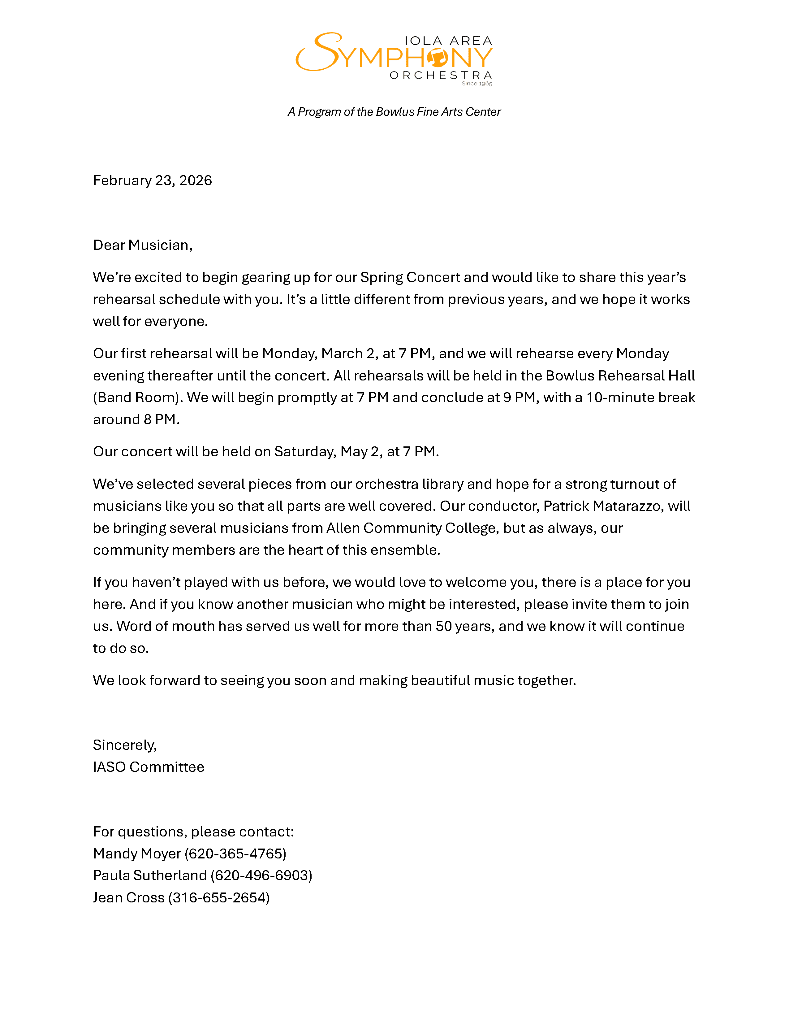 The Bowlus Fine Arts Center proudly welcomed the Iola Area Symphony Orchestra into its official programming beginning with the 2018–2019 season.