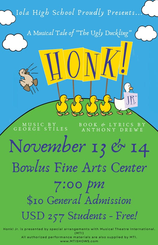 Join us for Honk! Jr. A heartwarming and hilarious musical based on The Ugly Duckling! Come see our talented cast bring this story to life on November 13 and 14 at 7:00 PM at the Bowlus Fine Arts Center.